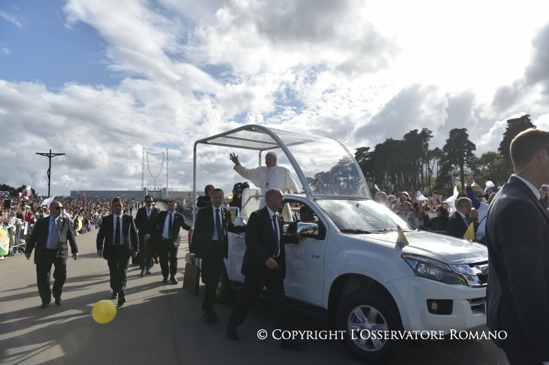Cari pellegrini di Maria e con Maria!Grazie per avermi accolto fra voi ed esservi uniti a me in questo pellegrinaggio vissuto nella speranza e nella pace. Fin d’ora desidero assicurare a quanti vi trovate uniti con me, qui o altrove, che vi porto tutti nel cuore. Sento che Gesù vi ha affidati a me, e abbraccio e affido a Gesù tutti, “specialmente quelli che più ne hanno bisogno” – come la Madonna ci ha insegnato a pregare. Ella, Madre dolce e premurosa di tutti i bisognosi, ottenga loro la benedizione del Signore! Su ciascuno dei diseredati e infelici ai quali è stato rubato il presente, su ciascuno degli esclusi e abbandonati ai quali viene negato il futuro, su ciascuno degli orfani e vittime di ingiustizia ai quali non è permesso avere un passato, scenda la benedizione di Dio incarnata in Gesù Cristo: «Ti benedica il Signore e ti custodisca. Il Signore faccia risplendere per te il suo volto e ti faccia grazia. Il Signore rivolga a te il suo volto e ti conceda pace».